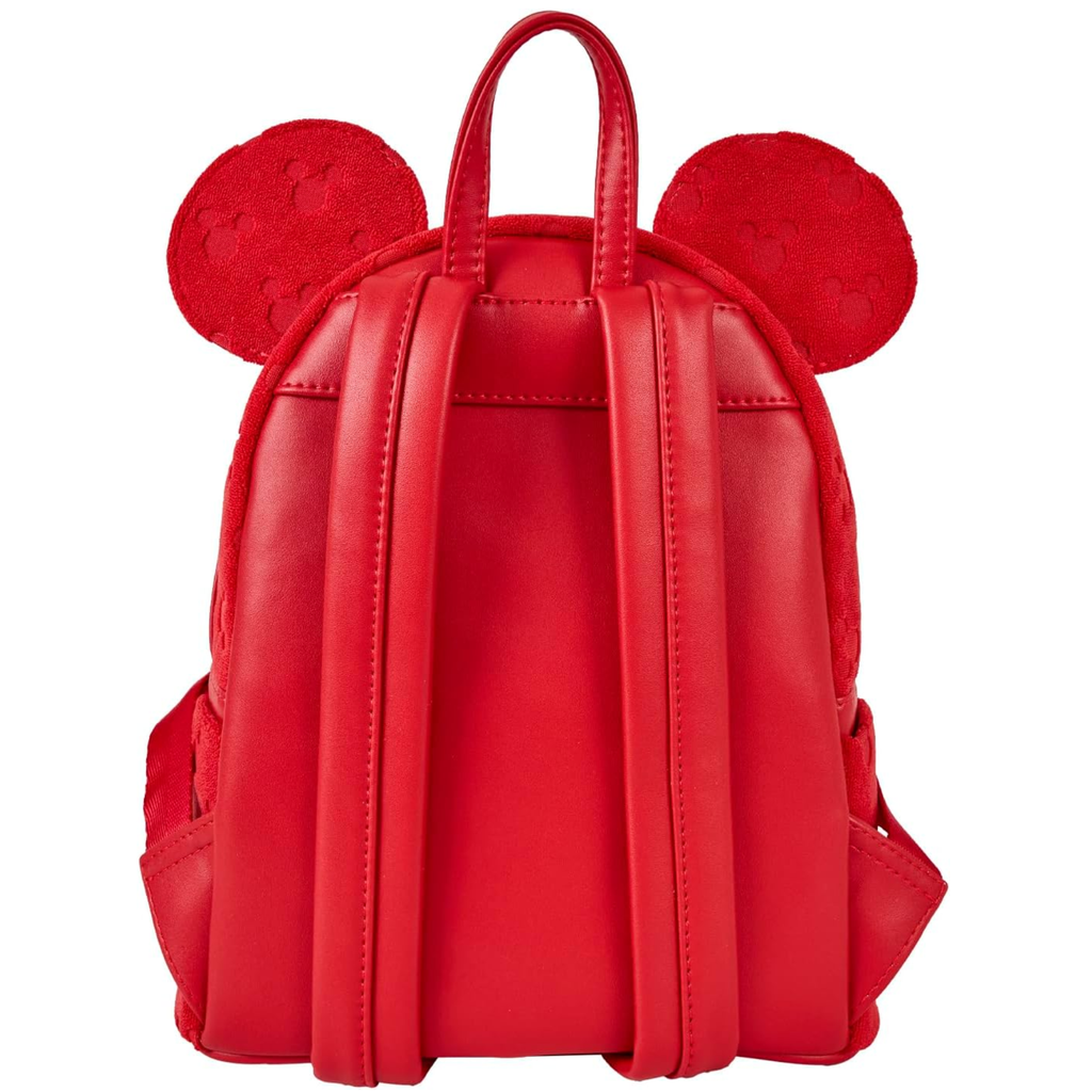 All Mickey all the time! This bag is ready to make a statement with you while keeping your essentials safe! This red mini backpack is made of faux leather and terry cloth. Mickey head silhouettes are "burned out" in the material to create an all-over pattern on the bag. This is a great accessory for any Disney fan that wants a little more Disney magic in their life. Features: Terry cloth mini backpack with faux leather (polyurethane) trim, adjustable shoulder straps, front zipped pocket, side drop pockets, 3D ears, Mickey Mouse-shaped coin bag, applique, burnout terry cloth, and printed details, coordinating interior lining.