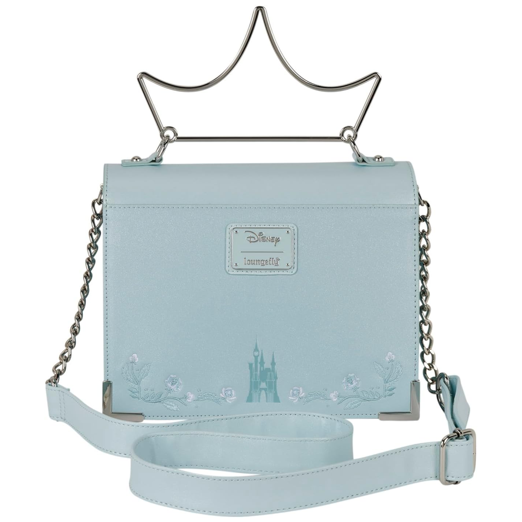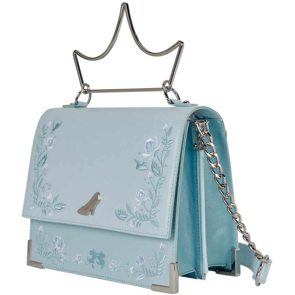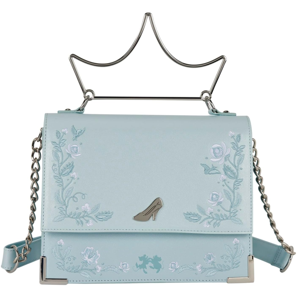 If Cinderella is your favorite Disney Princess, this bag is the perfect addition to your wardrobe! This bag features shimmery faux leather with embroidered floral details. In the center of the front flap, you'll find a molded metal charm of Cinderella's glass slipper. Attached to the top is a molded metal top handle in the shape of a tiara. This crossbody bag adds a regal feel to any outfit! Features: Faux leather (polyurethane), adjustable crossbody strap, molded metal charm & top handle, applique, embroidered, shimmer faux leather, and printed details, and coordinating interior lining. Dimensions: 9""W x 8""H x 3""D, 22.8cm W x 20.3cm H x 7.6cm D.