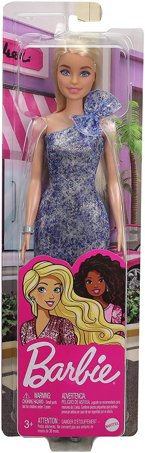 Barbie Blonde Hair Blue Eyes with Short Blue Sequins Mini Dress and Silver Platform Shoes