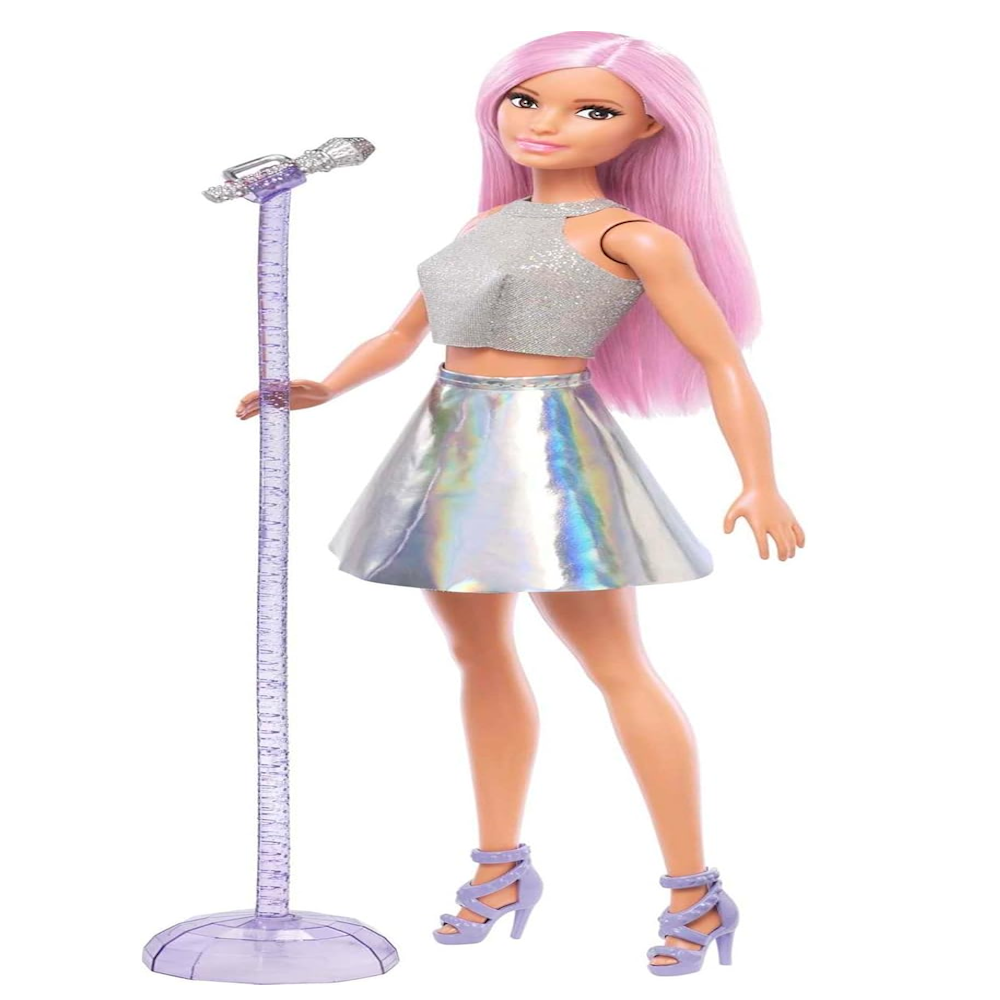 Barbie career dolls inspire kids to dream big and aim high! Each doll can achieve her goals wearing a career-themed outfit along with accessories to play out professional moments. There are so many careers to explore. Grab the microphone and share the spotlight with Barbie pop star doll. She wears an outfit that will sparkle on stage and comes with a microphone and stand. Plus, her long pink hair hits all the right notes! Explore and collect all the Barbie career dolls and toys because when a girl plays with Barbie, she imagines everything she can become (each sold separately, subject to availability). Includes pop star doll wearing fashions and shoes, plus microphone and microphone stand. Doll cannot stand alone. Colors and decorations may vary.