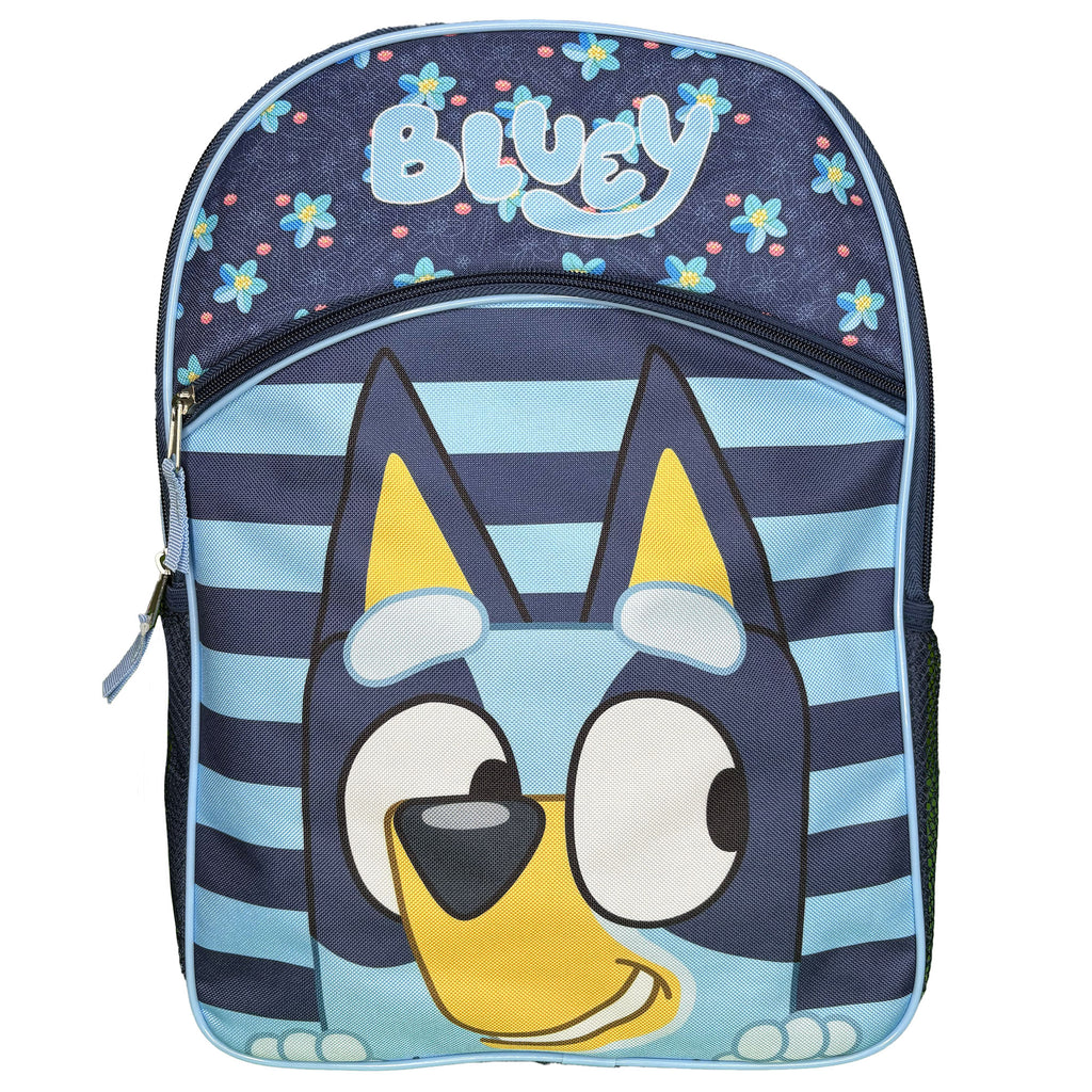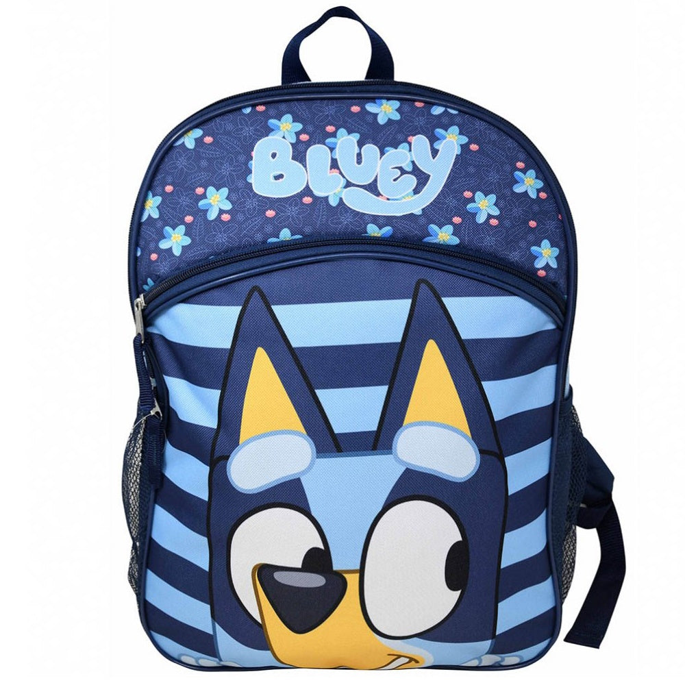 Make every school day an adventure with this delightful 16-inch backpack featuring the beloved Bluey character. The navy blue base showcases a charming design with Bluey's playful face set against light blue stripes, while the top portion is decorated with adorable blue flowers and pink accents. Perfect for young students, this backpack combines fun and functionality with its roomy main compartment, secure zipper closure, and comfortable shoulder straps. The mesh side pockets provide easy access to water bottles or small items, while the durable construction ensures it can keep up with daily activities. The backpack's cheerful design and practical features make it an ideal choice for carrying school supplies, books, or everyday essentials. The large character face and floral pattern will surely bring smiles to faces while keeping belongings organized and secure.