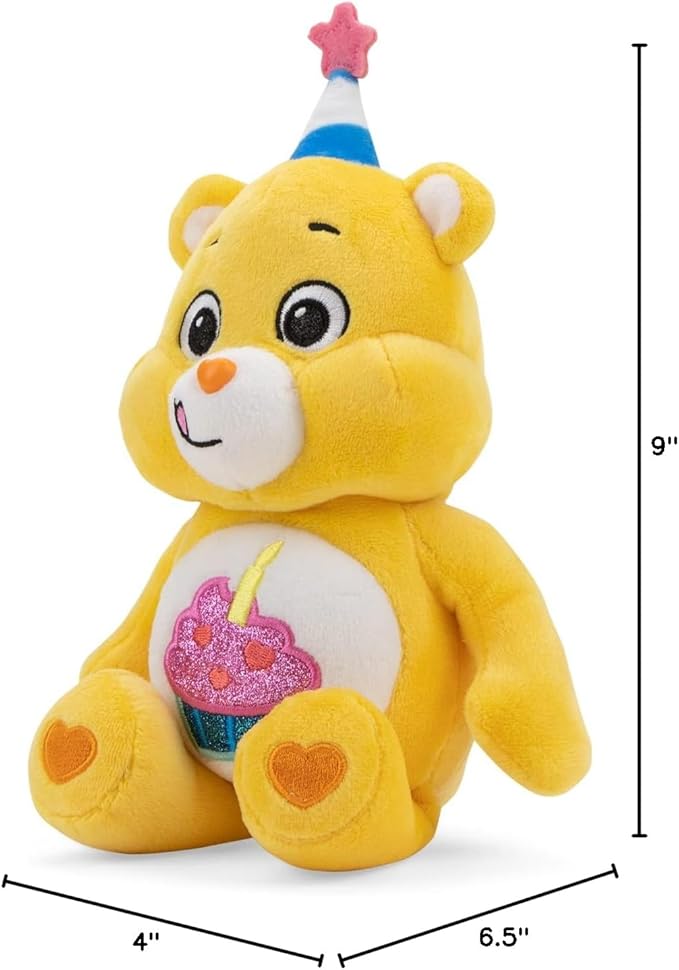 Care Bears 9" Bean Plush (Glitter Belly) - Birthday Bear - Soft Huggable Material! Description These adorable Care Bears have a twinkle in their eye and on their bellies! The Care Bears are a lovable collection of Bears on a mission: to spread smiles and joy with their NEW glitter eyes and beautiful glitter belly badges! And with NEW character expressions, theyre sure to dazzle you with delight! At 9 inches in size, the Glitter Birthday Bear Bean Plush toy is perfect to celebrate your special day and bring on any adventure, big or small.