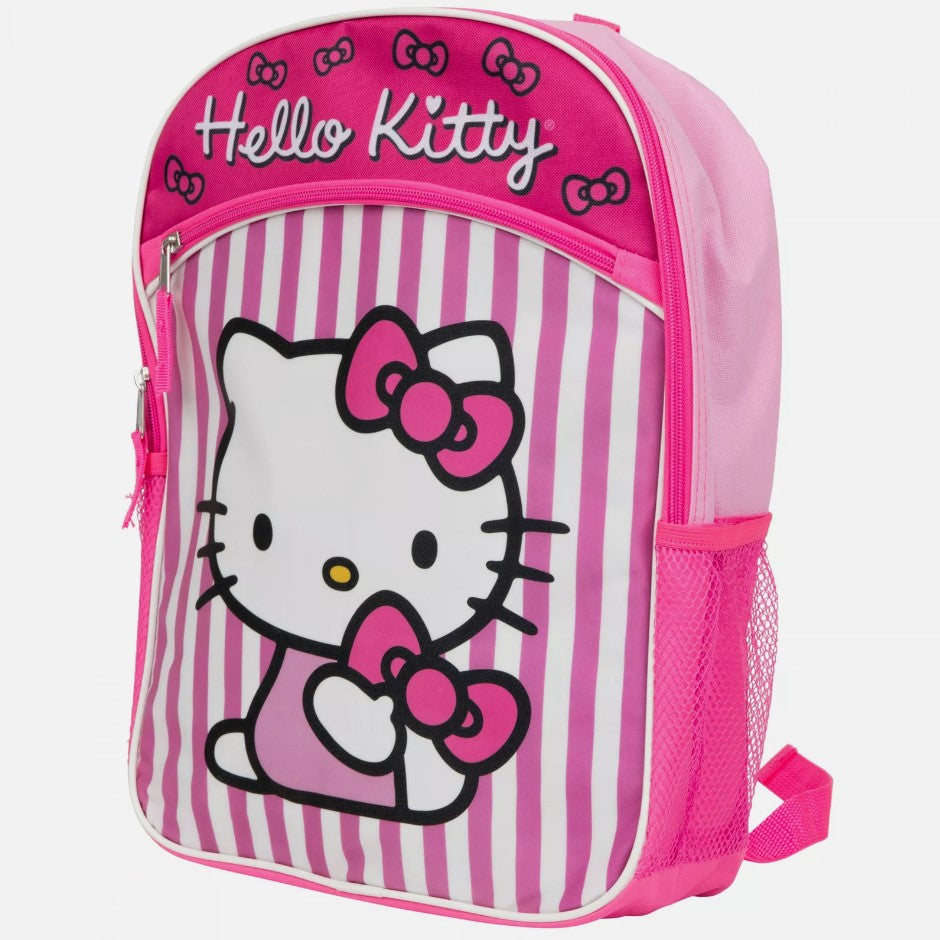 Carry your favorite things to your next Hello Kitty party with the help of this officially licensed Hello Kitty Bows and Stripes 16" Backpack with One Front Pocket. This pink Hello Kitty 16" Backpack is made from polyester and features a cute Hello Kitty Bows and Stripes character design on the front pocket.