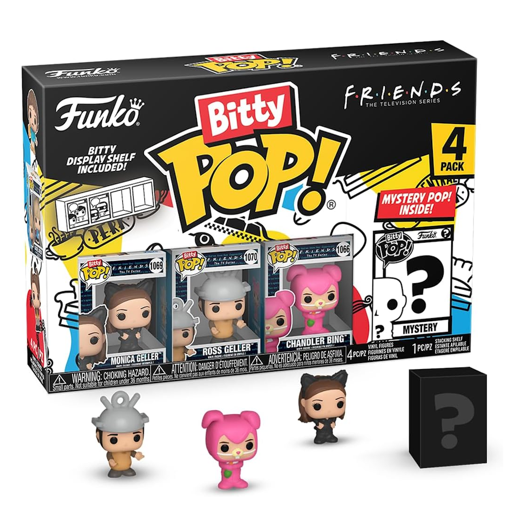 Your favorite Friends™ Pops! have been shrunk into Bitty Pops! Expand your collection with this assortment of Bitty Pop! figures featuring your most beloved sitcom characters as miniaturized figures! This 4-pack includes Bitty Pop! Monica Geller™ (Halloween Costume), Bitty Pop! Ross Geller™ (Halloween Costume), Bitty Pop! Chandler Bing™ (Halloween Costume), and a mystery Bitty Pop! figure. The possible mystery Bitty Pops! are Hyper Rare (1/6) Joey Tribbiani™ (Cowboy), Hyper Rare (1/6) Phoebe Buffay™ (Music Video), Rare (1/3) Phoebe Buffay™ (Halloween Costume), and Rare (1/3) Joey Tribbiani™ (in Chandler’s clothes). Bitty Pops! are packaged in hard acrylic cases with detachable bottom lids. Detachable bottom lids double as acrylic bases, to which the Bitty Pop! figures are adhered. Sort and arrange your Bitty Pops! with the included display case! Acrylic display cases are stackable and hold four Bitty Pop! figures each. Vinyl figures are approximately 0.9-inches tall. Four figures per single package purchase. Warning: Choking Hazard. Collectibles are small. Not for children under the age of 3 years old. Item selection is random, as each piece is in blind packaging. We cannot accept requests for specific items. You may receive duplicate figures.