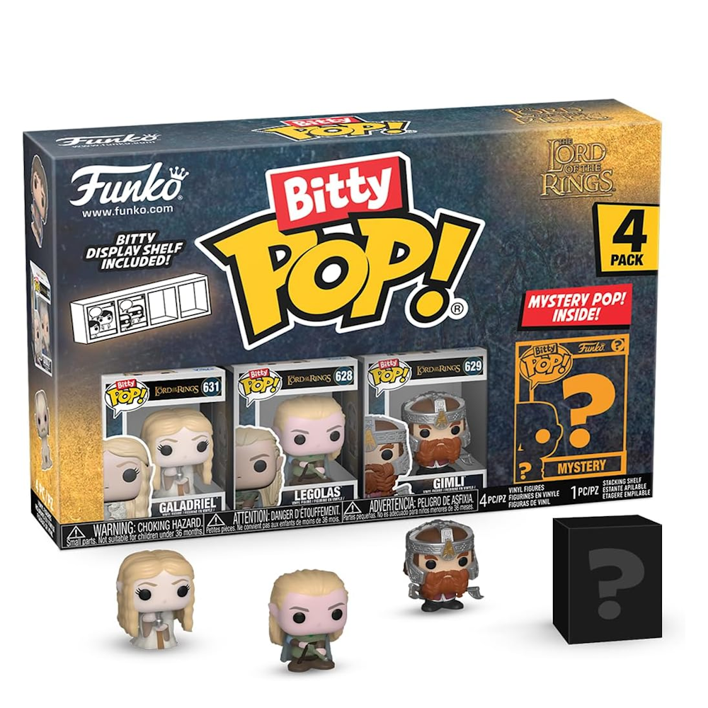 Your favorite The Lord of the Rings™ Pops! have been shrunk into Bitty Pops! Expand your Middle Earth™ collection with this assortment of Bitty Pop! figures featuring your most beloved The Lord of the Rings characters! This 4-pack includes Bitty Pop! Galadriel™, Bitty Pop! Legolas™, Bitty Pop! Gimli™, and a mystery Bitty Pop! figure. The possible mystery Bitty Pops! are Rare (1/3) Aragorn™, Rare (1/3) Nazgul™, Hyper Rare (1/6) Boromir™, and Hyper Rare (1/6) Saruman™. Bitty Pops! are packaged in hard acrylic cases with detachable bottom lids. Detachable bottom lids double as acrylic bases, to which the Bitty Pop! figures are adhered. Sort and arrange your Bitty Pops! with the included display case! Acrylic display cases are stackable and hold four Bitty Pop! figures each. Vinyl figures are approximately 0.9-inches tall. Four figures per single package purchase. Warning: Choking Hazard. Collectibles are small. Not for children under the age of 3 years old. Item selection is random, as each piece is in blind packaging. We cannot accept requests for specific items. You may receive duplicate figures.